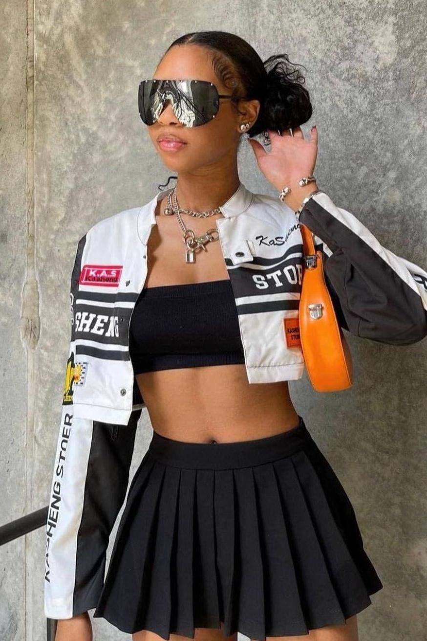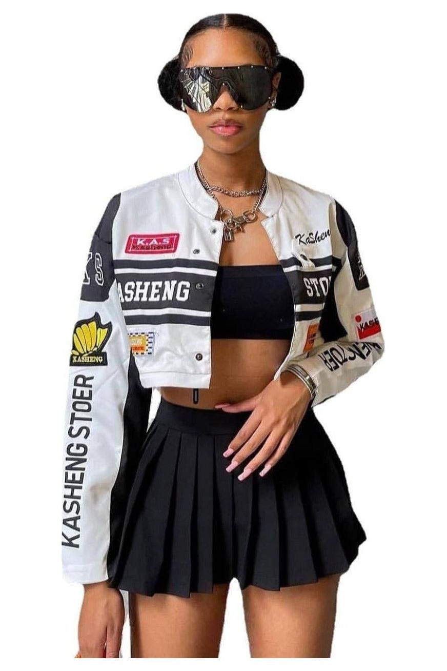 Vintage inspired. this American retro motorcycle jacket is an ideal wardrobe staple for any stylish woman. The stylish design makes it a versatile addition to any look. Wear it with a blouse and jeans for casual Friday or with a casual tee and jeans for a more adventurous vibe. The comfortable fit and lightweight fabric is ideal for any season. Graphic jacket for women can be worn as cropped top and mini skirt!To adjust the jacket. use the middle zipper to unzip the waist and turn upside down.and fasten it with snap buttons and you will get the two piece skirt set!