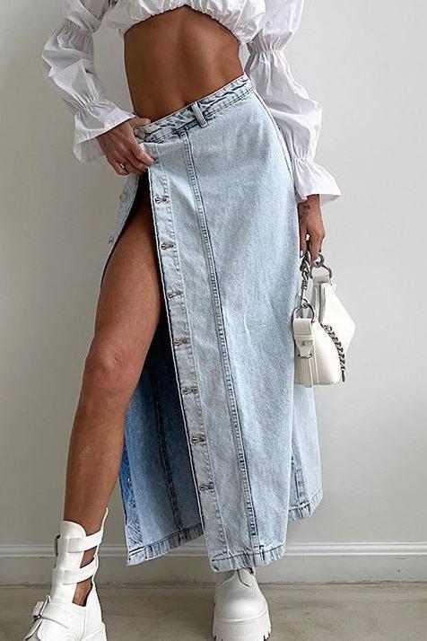 Add some timeless style to your wardrobe with this American retro slit denim long skirt! It's crafted from high-quality denim with a flattering silhouette. making it perfect for any occasion. Its unique slit design adds a stylish element that will make you stand out. Get ready to make a fashion statement with this timeless classic.