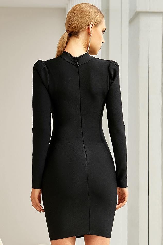 This classic black evening dress features an elegant silhouette with a bandage style bodice and features a zip closure in the back. Constructed of a cotton blend. the highly structured fabric ensures a flattering fit and provides maximum comfort. Perfect for formal occasions. this dress will have you looking chic and sophisticated.