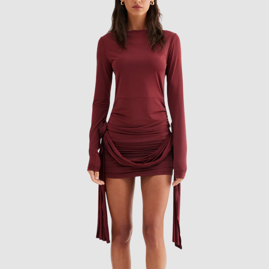 This long sleeve rose detail ruched bodycon dress brought to you in a soft touch material with long sleeves will be your new favorite summer dress. With its straight neckline and long sleeves. this mini dress is both sexy and sophisticated. This dress features a rose design and ruched detailing.