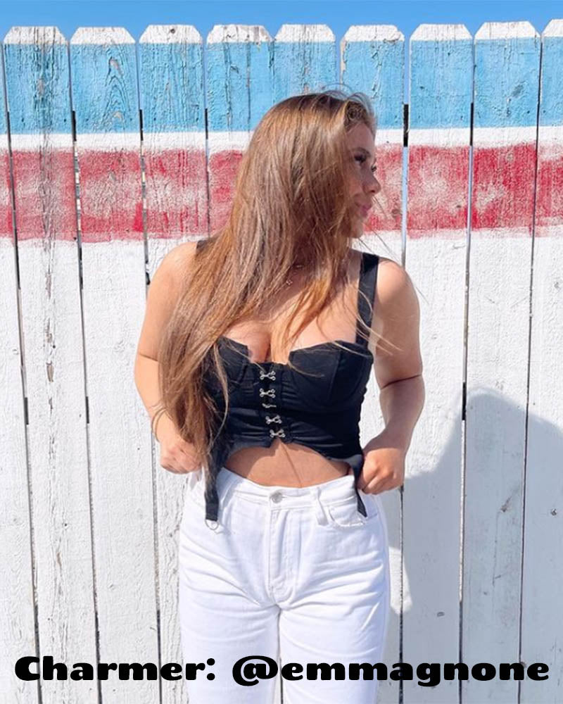 Details: Black corset top with unique buckle and suspender designs