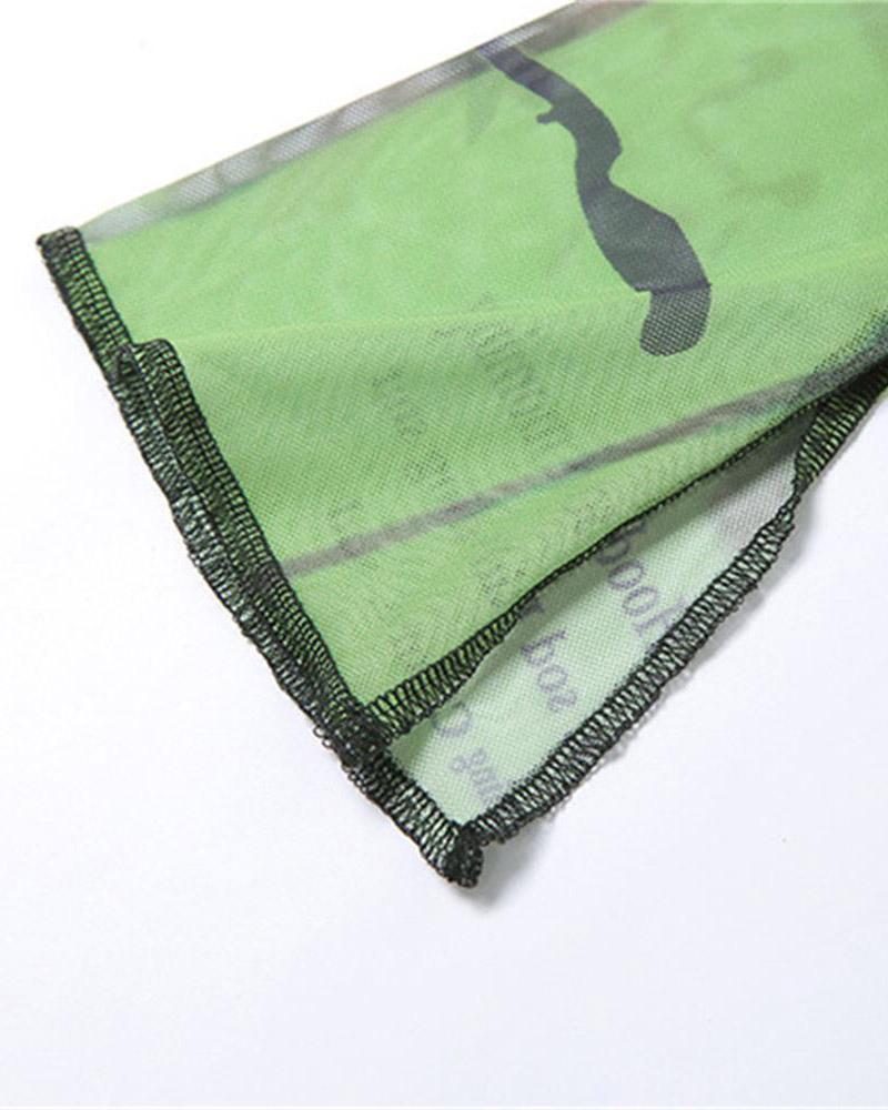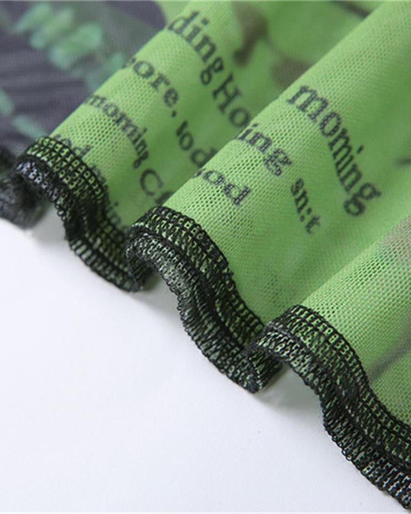 Details: Mesh material long sleeve top with letter and abstract prints
