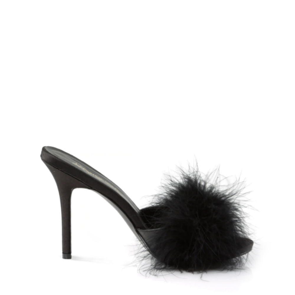 This Feather Stiletto Sandal provides a prim look with its feather coated upper. faux suede base. pointed open toe. mule design. metallic accents. and sculpted stiletto heel. Safe to stay we're in love with this pair.