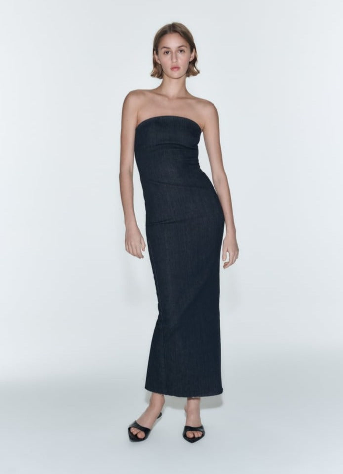 Update your wardrobe this season with this denim dress. Comprised of a durable yet firm denim that nails effortless glam. this style is structured yet casual. and versatile for all seasons.