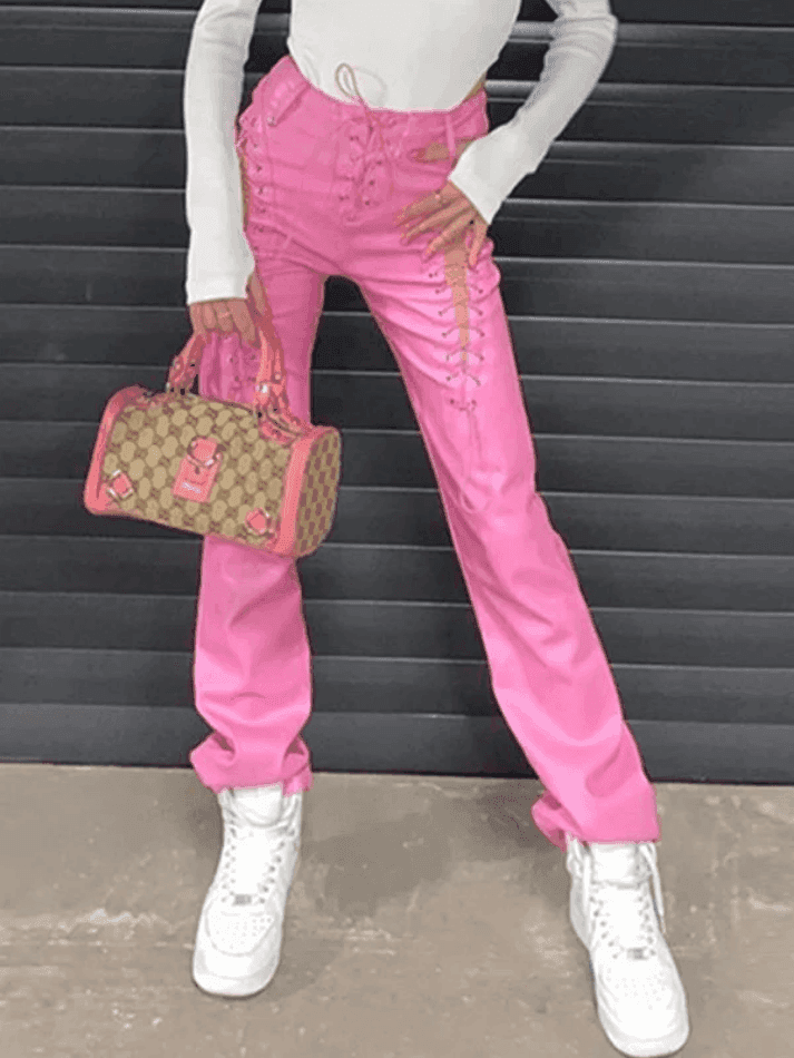 Style: Street Color: Pink Main Material: Polyester. Spandex Fit Type: Regular Design: High Rise Waistline. Adjustable Tie Strap With Eyelet Detail. Belt Loops. Straight Leg Fit