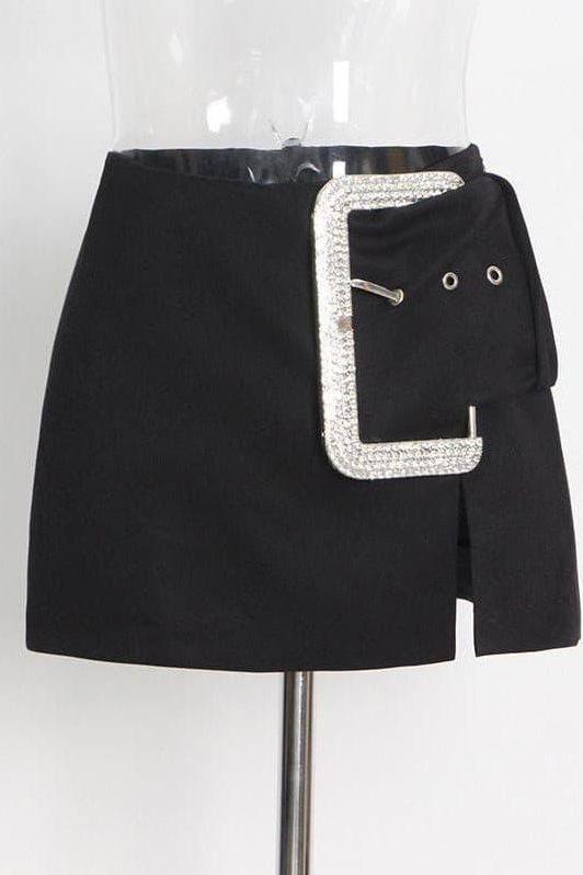 This stylish skirt features a diamond buckle detail and a dramatic side slit. Crafted from quality materials. it is designed to hold its shape. The timeless design and flattering silhouette make it perfect for any occasion.