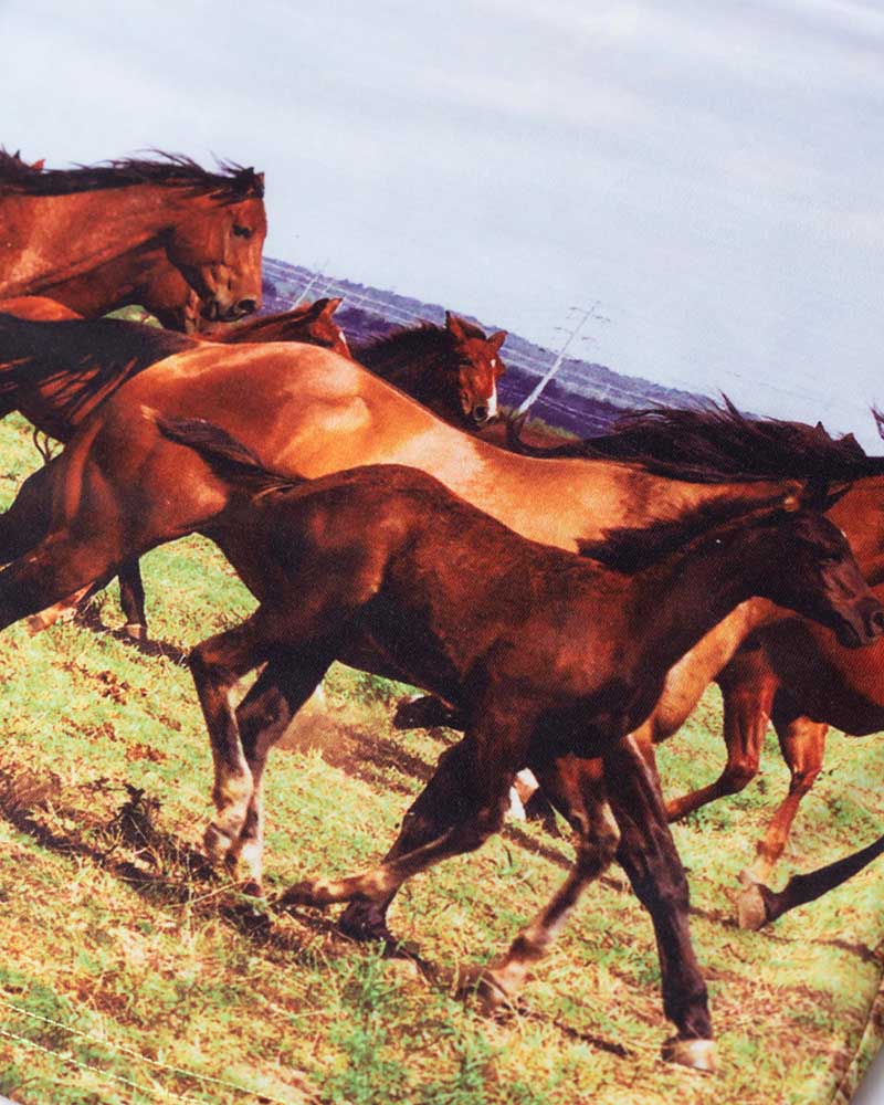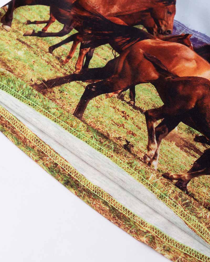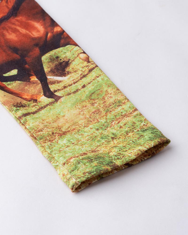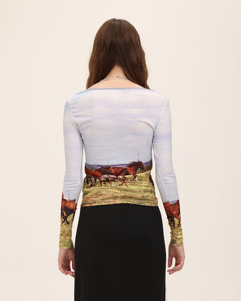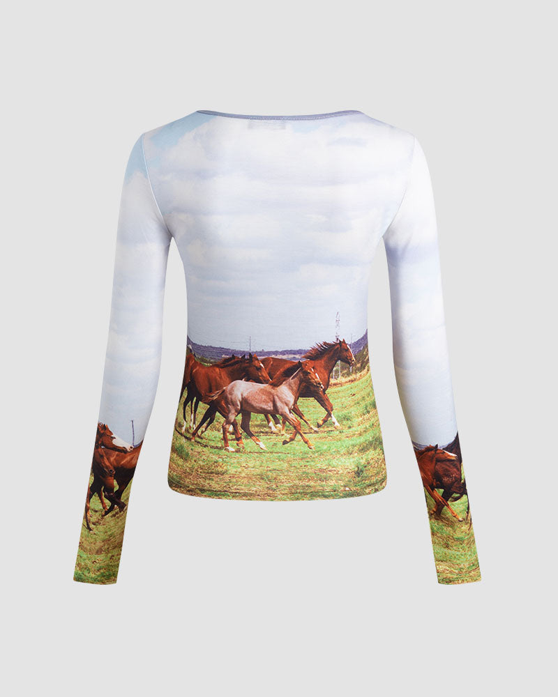 Details: White long-sleeve top with horses graphical prinK