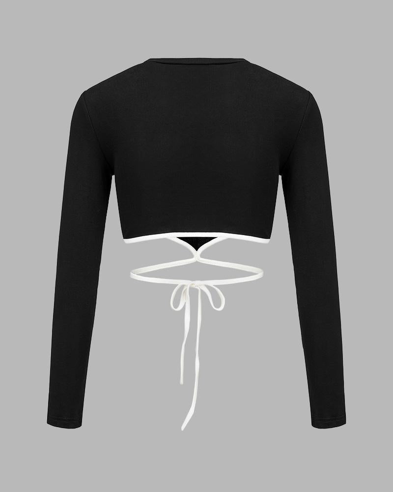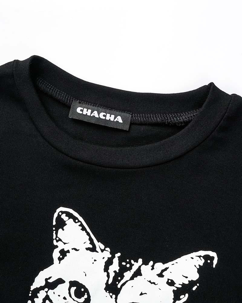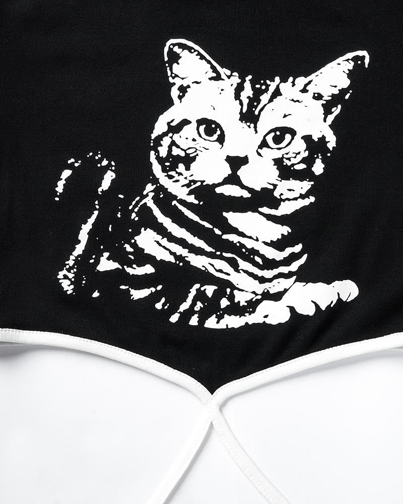 Details: Long-sleeve cropped top with cat graphical print and waist-line string design