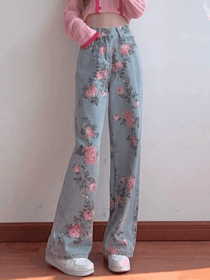 Style: Casual/Street/Sweet/Y2K/Vintage Color: Blue Main Material: Cotton Blend Fit Type: Boyfriend fit Design: With floral-inspired print. this blue jeans sitting to high rise silhouette. with multi pockets design and zip & button fasten at front.