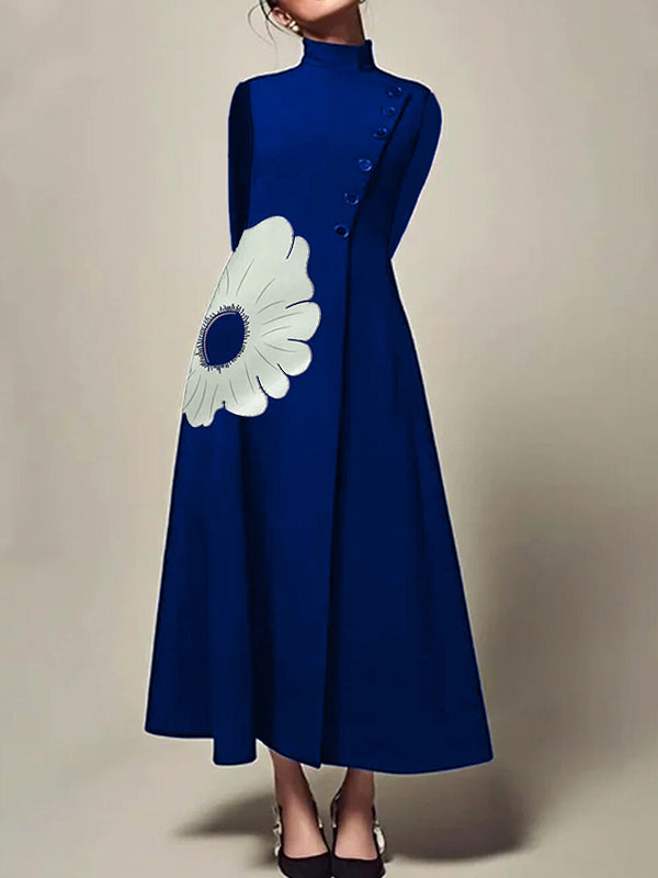 A-Line Long Sleeves Flower Print High Neck Midi Dresses
