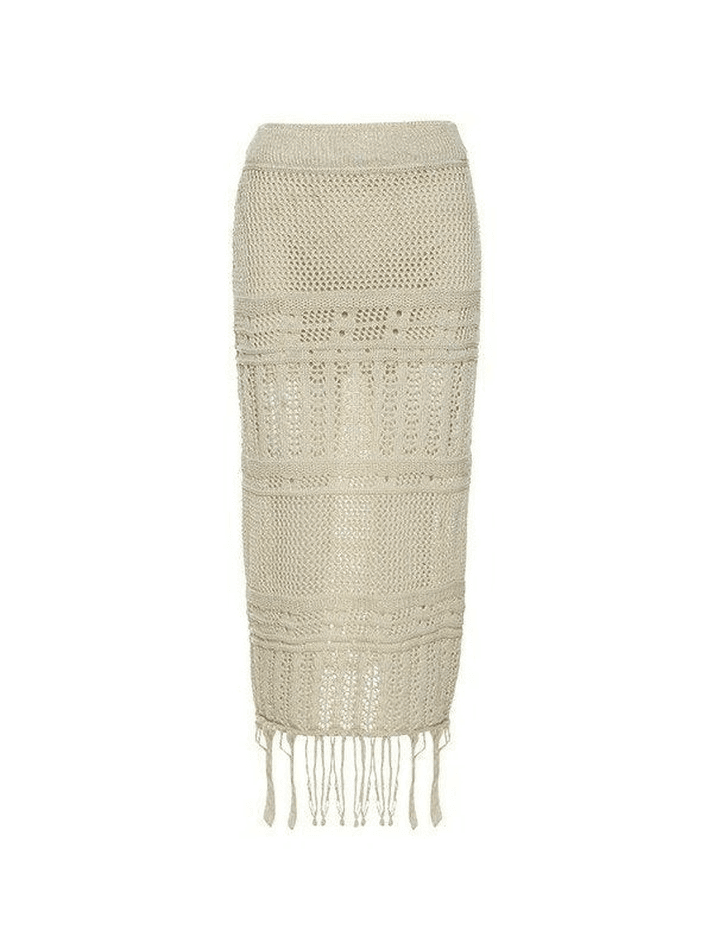 Style: Casual/Street/Y2K/Sweet/Vacation Fabric Content: Polyester Blend Fit Type: Slim fit Length: Maxi Skirt Design: These long beach skirts sit to an elasticated waist. are made from crochet knit fabric. and feature fringe detail at the hemline.