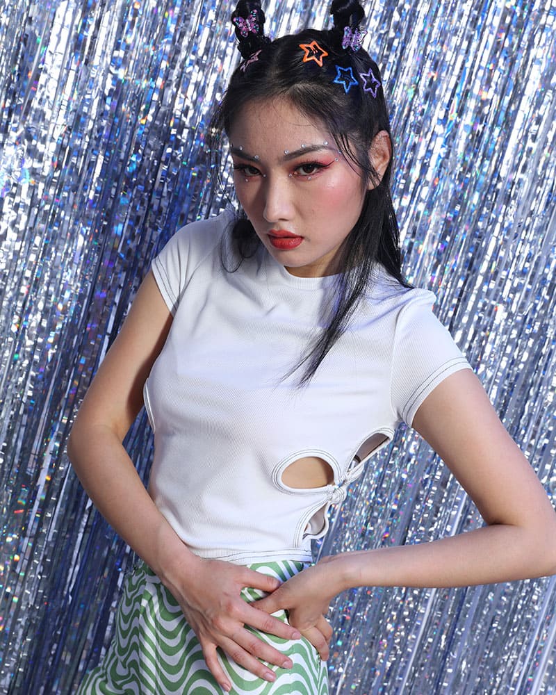 Details: Ribbed short-sleeve top withfour-leaf clovers cutout at sides