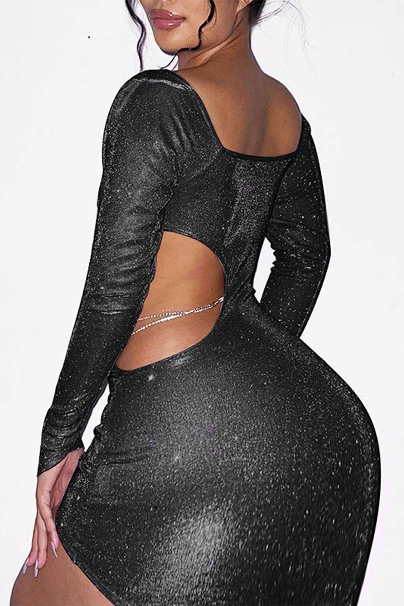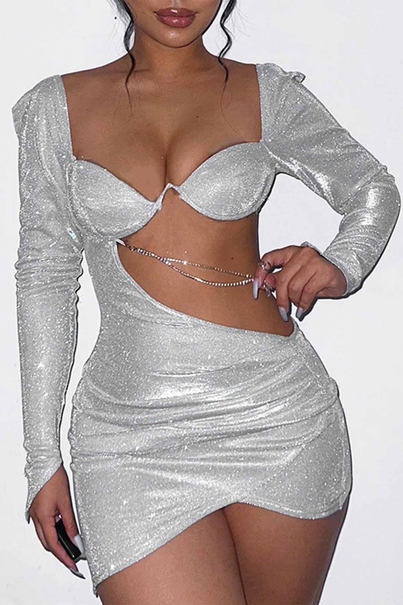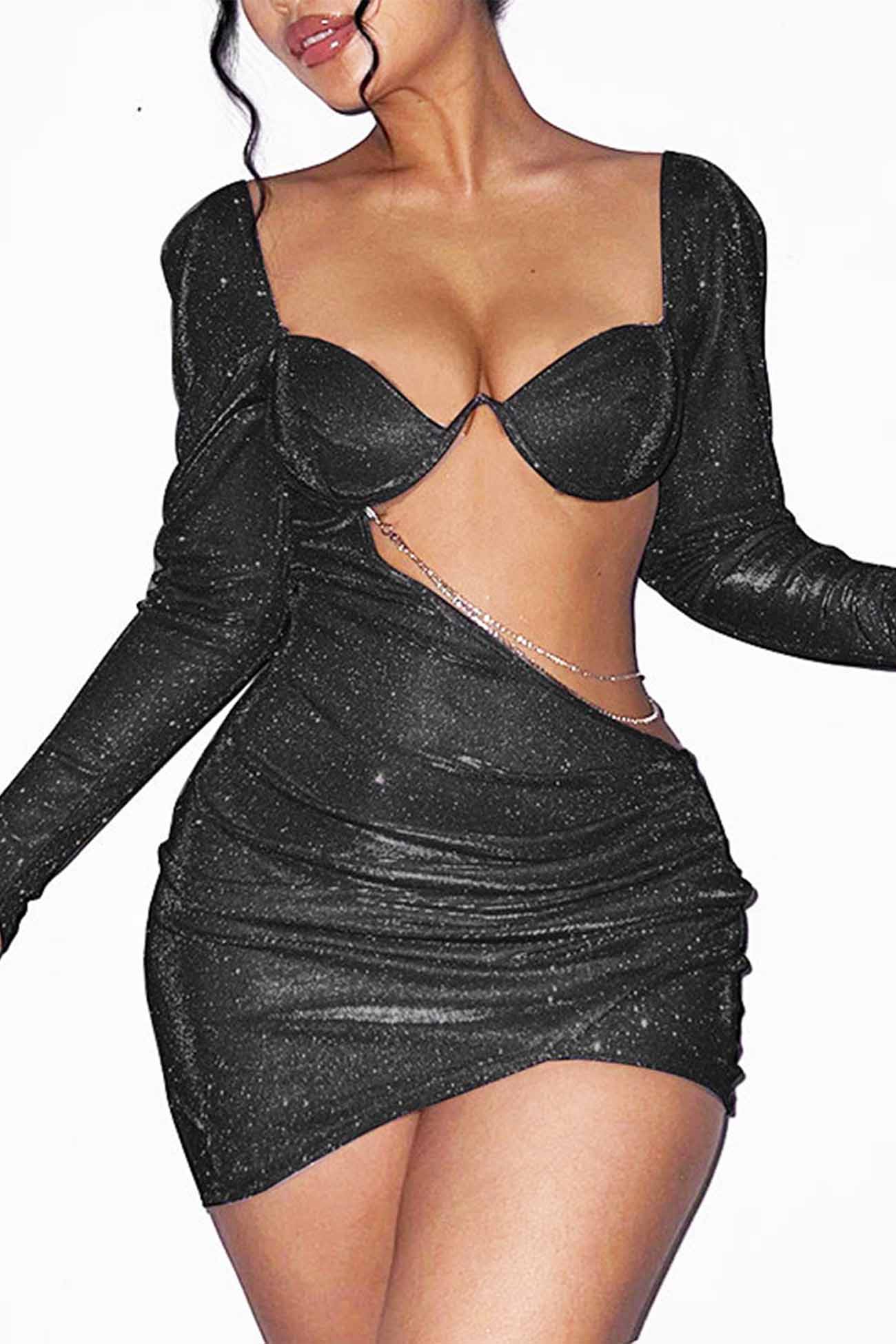 Hollow Glitter Chain Long Sleeve Ruched Mini Dress