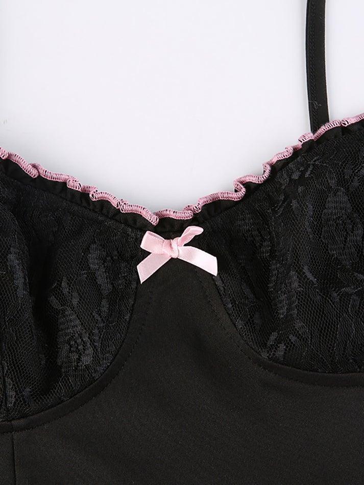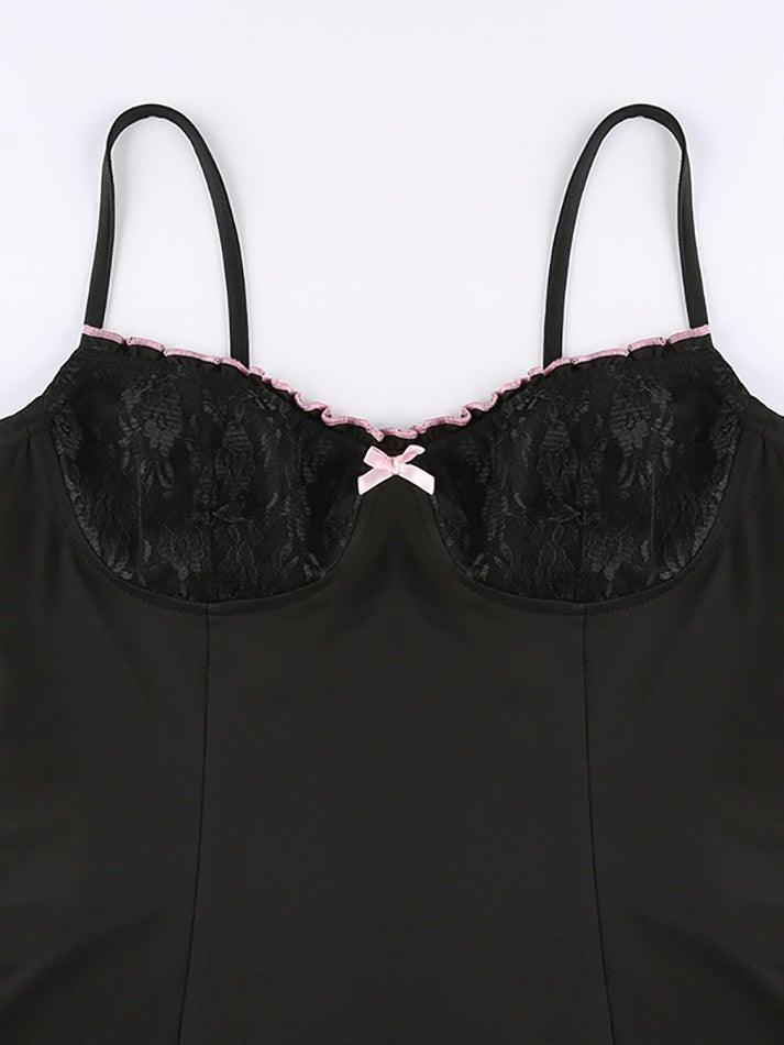 Style: Casual. Sexy Color: Black Fabric Content: Polyester. Spandex Fit Type: Slim fit Sleeve Length: Sleeveless Neckline: V Neck Length: Above Knee Design: Multi Bow Decor. Frill Trim Detailing