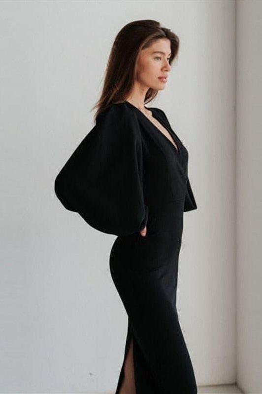 This dress features a flattering V-neck. a unique lantern sleeve design and an accentuated hip-hugging fit. It is made from a lightweight and soft fabric blend for ultimate comfort and breathability. The fabric blend also creates a slimming silhouette. making it an ideal choice for any body type.