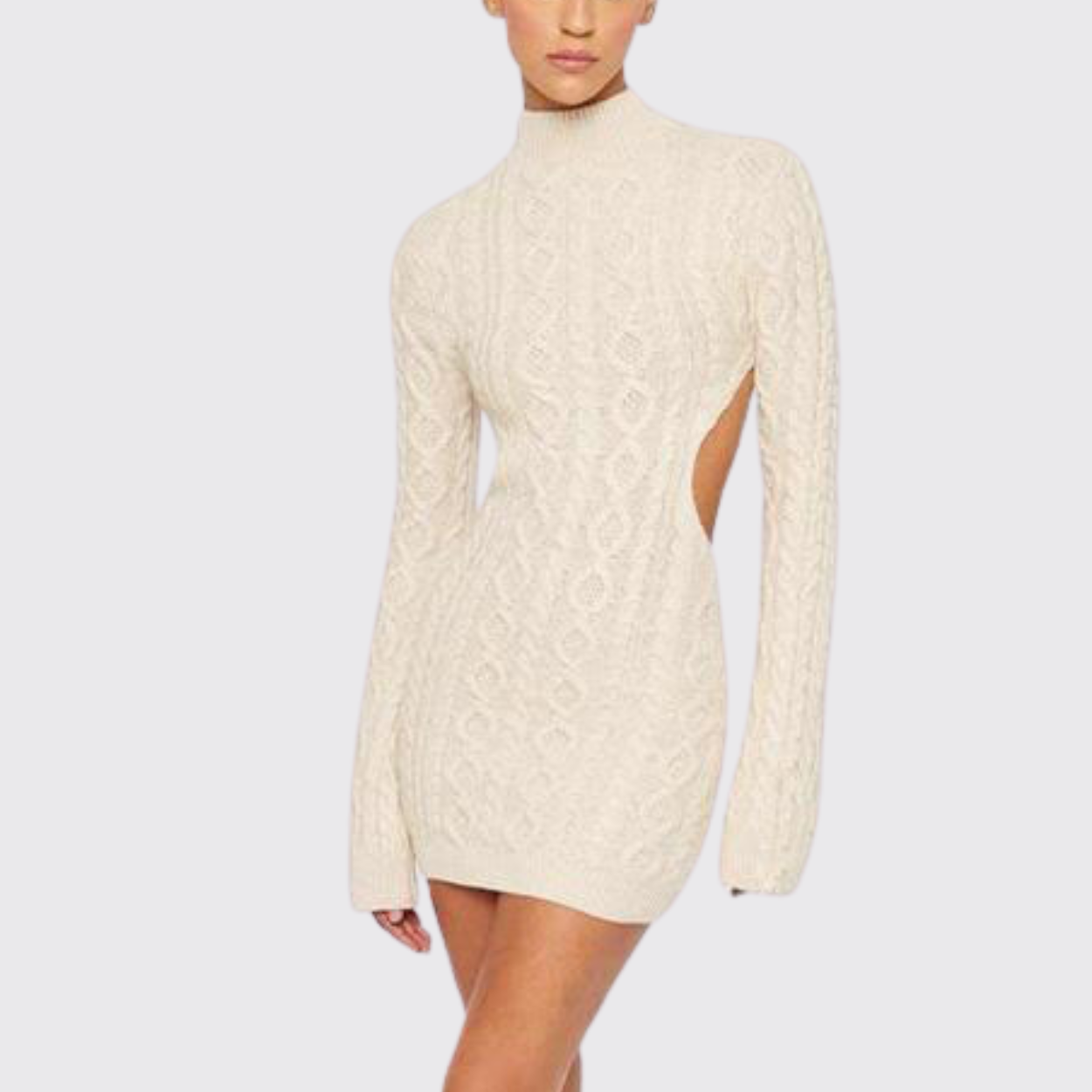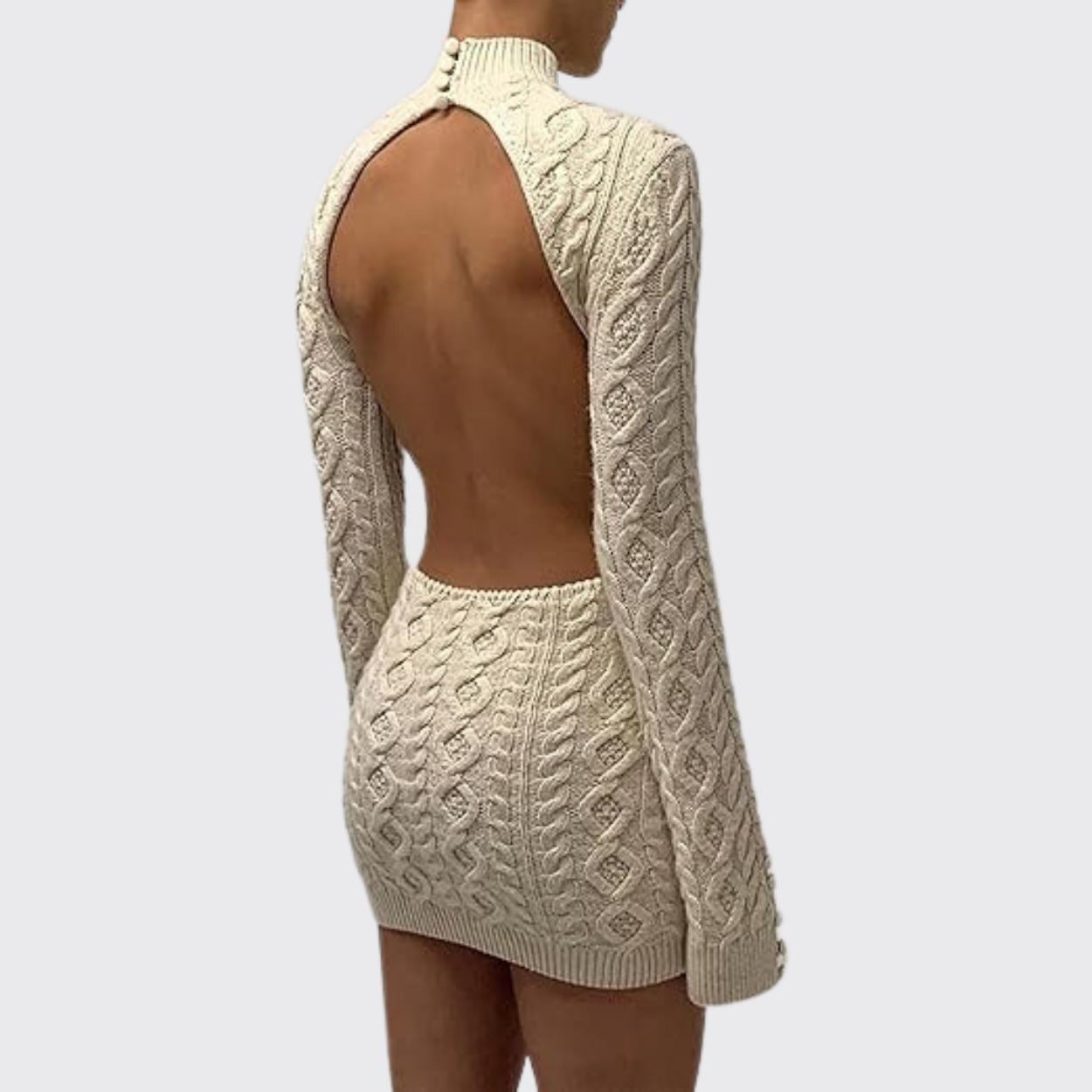 Update your fall wardrobe with this stunning dress. This long sleeved turtle neck dress features an alluring open back design that combines comfort with style.