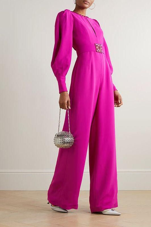 Be the center of attention in this stunning magenta crepe jumpsuit! Voluminous. bell-style sleeves give the outfit a contemporary flair. making it perfect for any special occasion. Make a statement and turn heads in this timelessly beautiful ensemble.