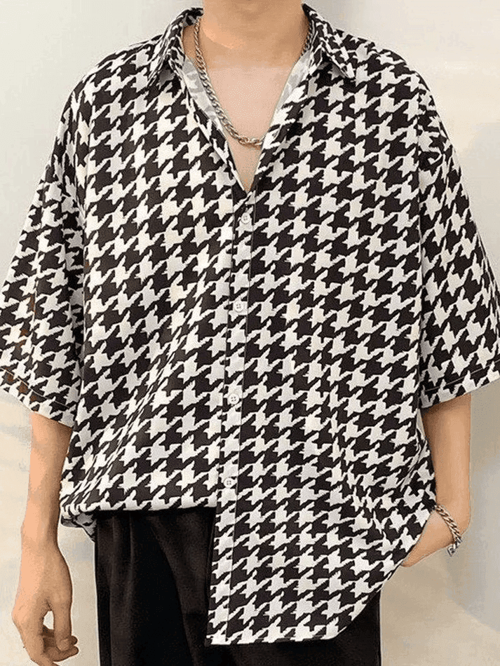 Description: Shaped to a fitted silhouette. these vintage short sleeve shirts are printed with a houndstooth checkered pattern. with a drop shoulder and front button fasten design.