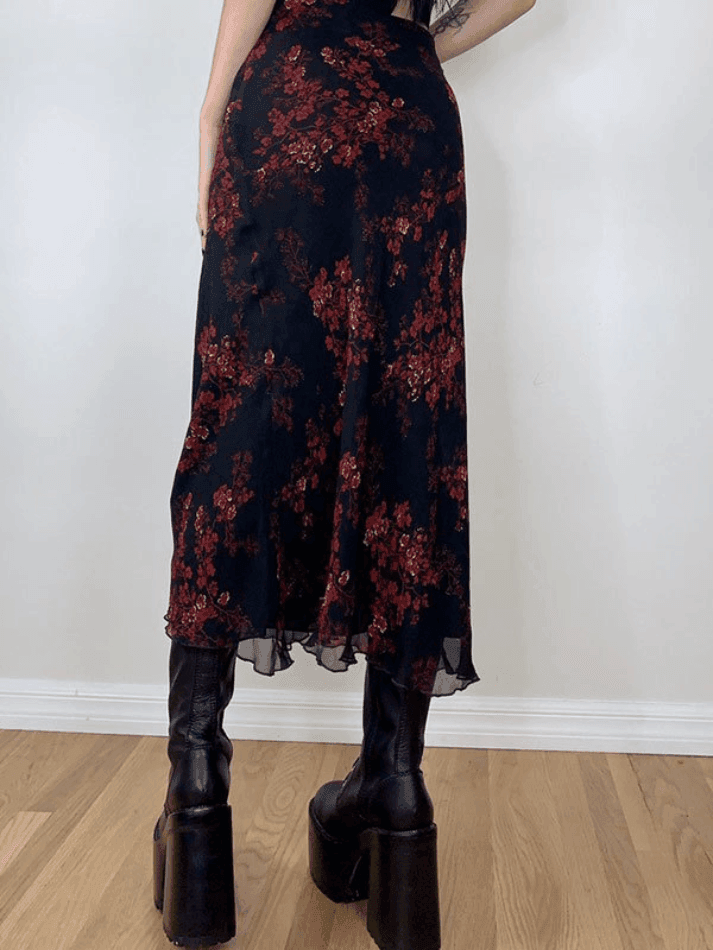 Style: Casual. Street Color: Black Fabric Content: Polyester Blend Fit Type: Regular Length: Midi Skirt Design: Floral Print At Front & Back. Mesh Paneled Detailing