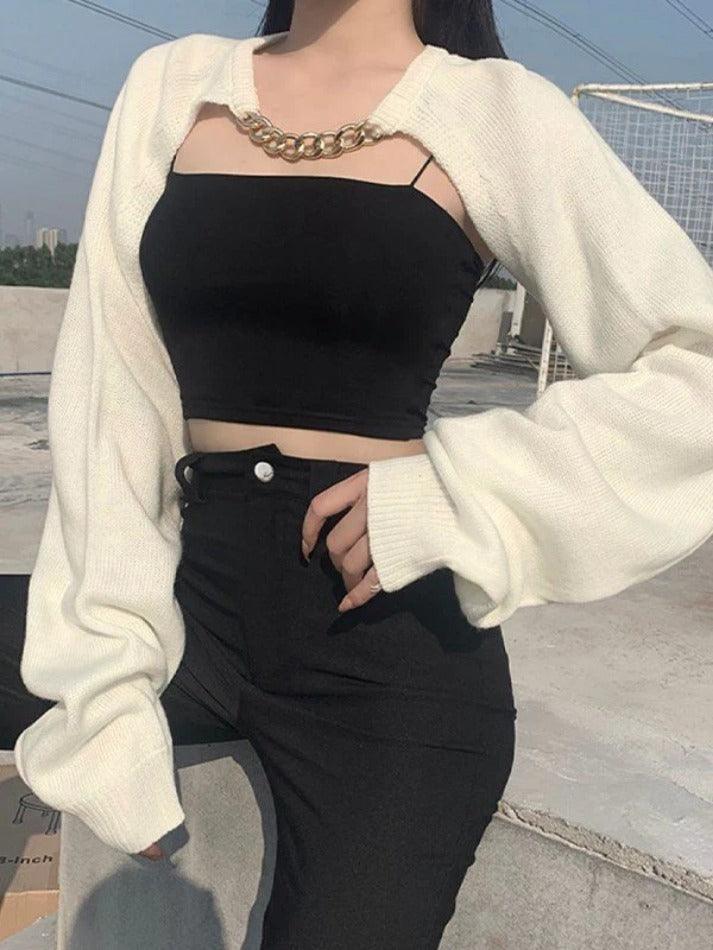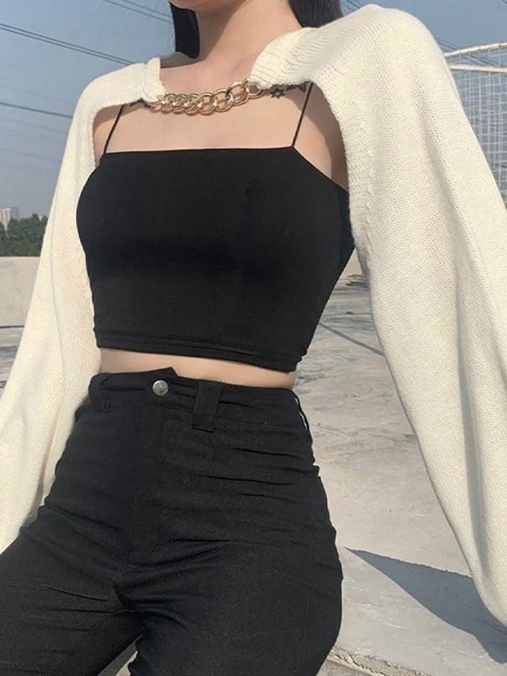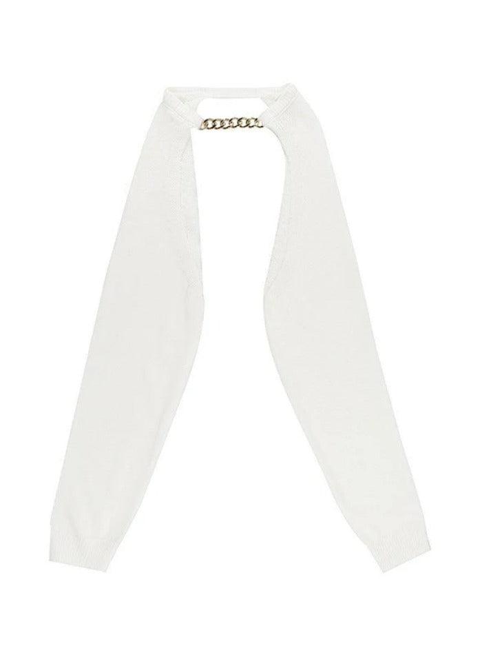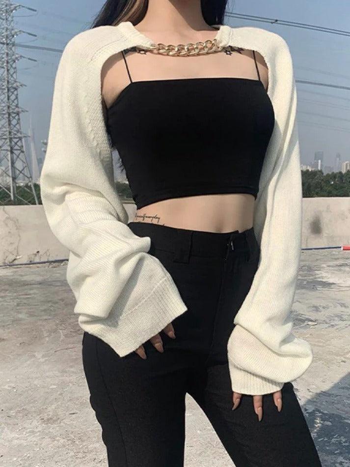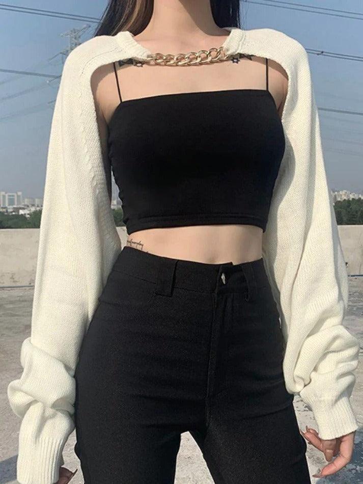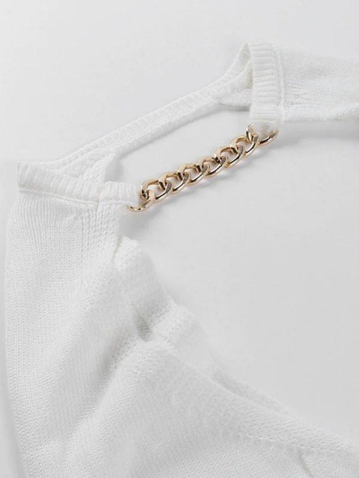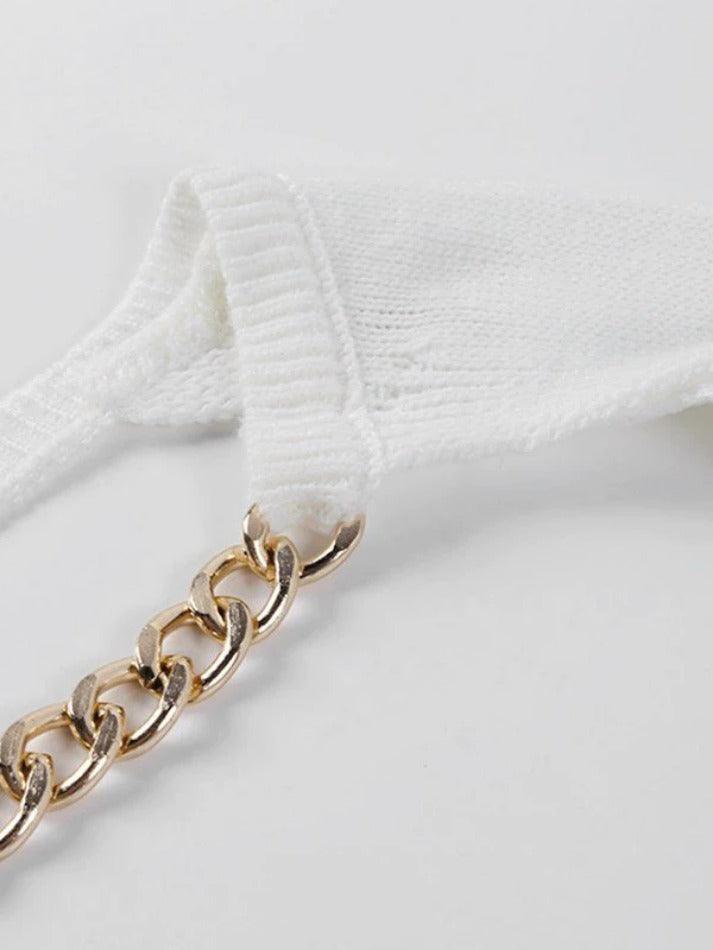Style: Casual/Street/Y2K/Punk/Sexy/Grunge Fabric Content: Polyester Blend Fit Type: Regular fit Neckline: Crew Neck Sleeve Length: Long Sleeve Design: Features ribbed trims and chain embellished at collar.