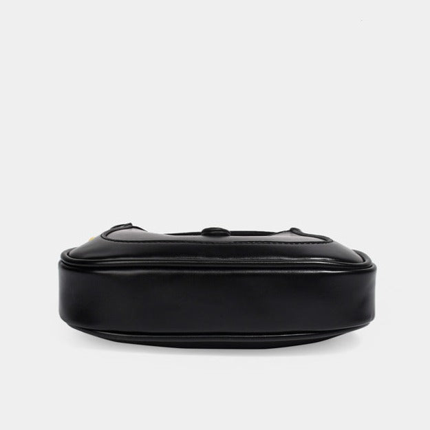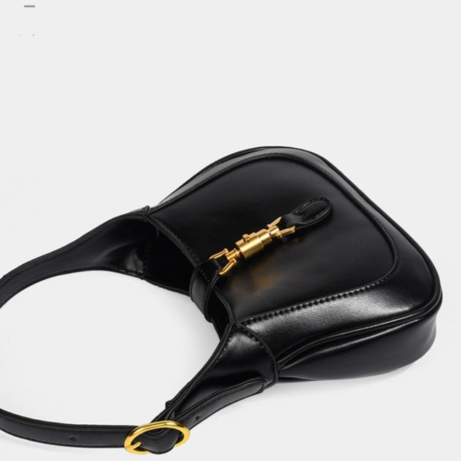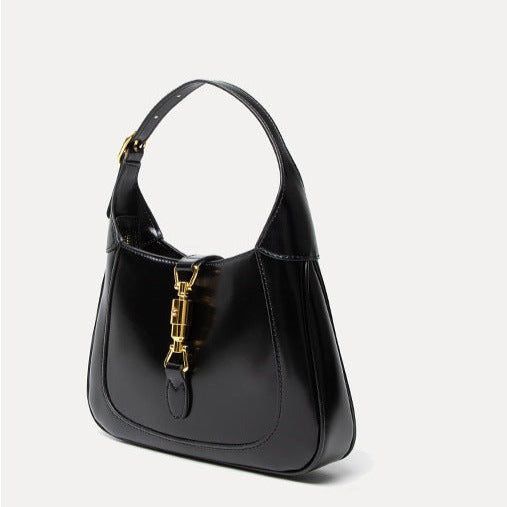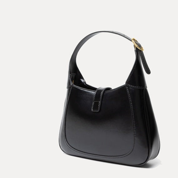Black Classic Curved Leather Handbag with Signature Buckle Closure