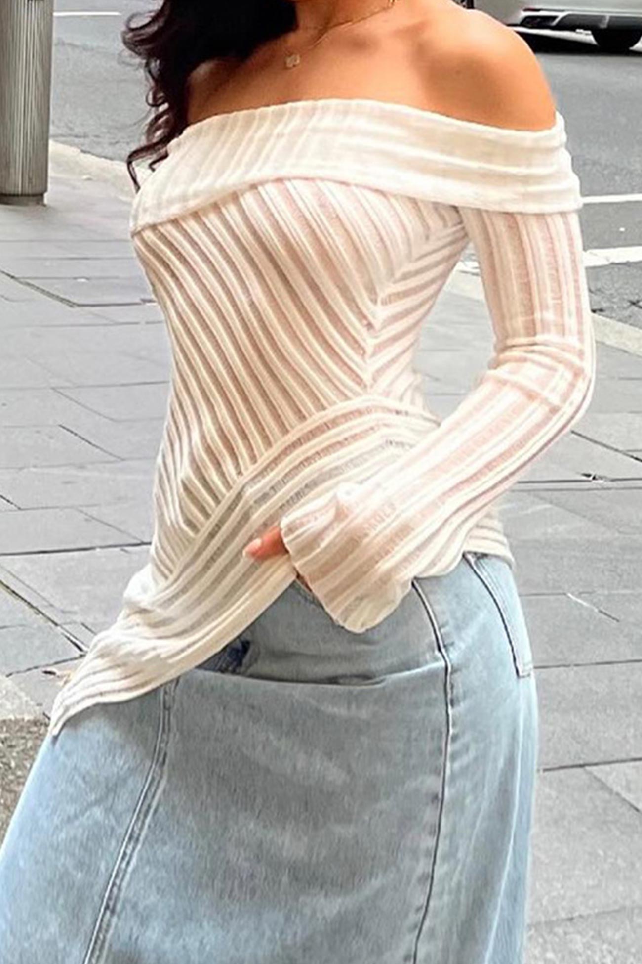 Increase quantity for Off Shoulder Striped Textured Hollow Out Tops