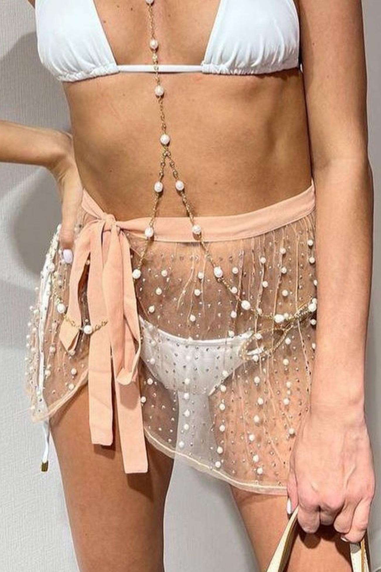 Dare to flaunt your curves with this Pearl Strappy Cover-up Mini Skirt! Oozing with beach glamour. this skirt is ideal for a beach day or night. blending pearls and style for an effortless look. Get ready to sparkle and shine!