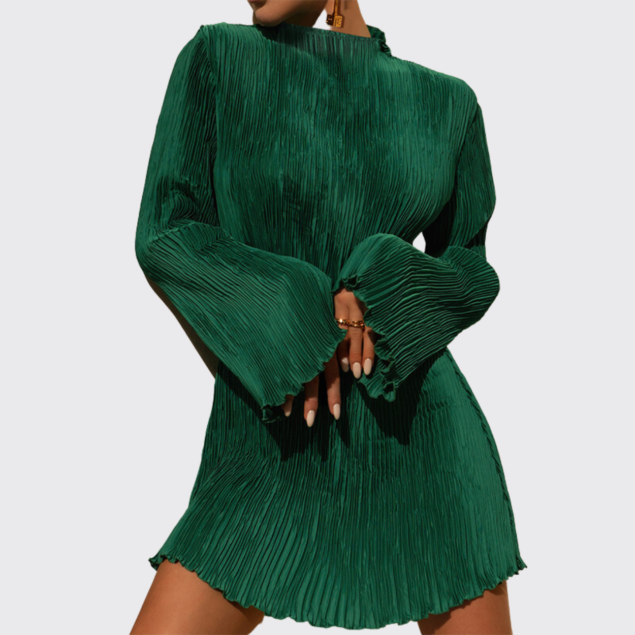 This long sleeve pleated mini dress is designed for to combine style and comfort in one package. Its finely crafted pleats create an elegant movement and the long sleeve add a classy touch to the dress.