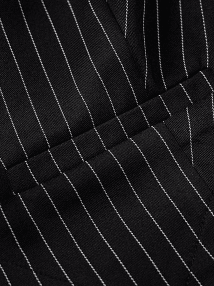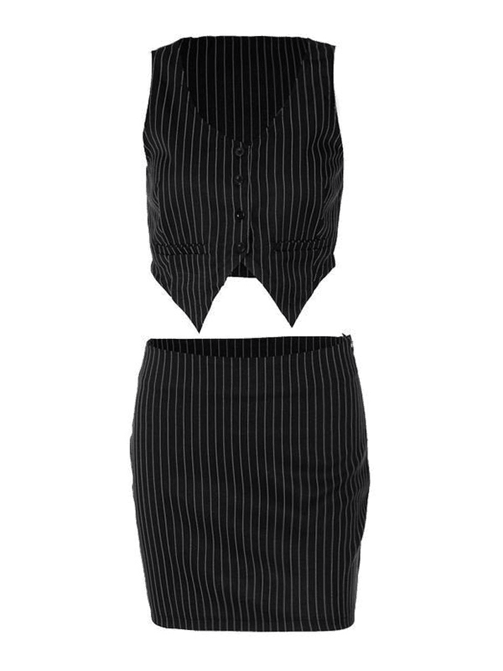 Style: Casual/Street/Y2K/Elegant/Workwear/Vintage Color: Black Fabric Content: Polyester. Spandex Fit Type: Slim fit Design: Crop Tank Top & Mini Skirt Set Allover Pinstriped Pattern Featuring Button Closure At Front Asymmetrical Hem With Concealed Zip Fastening