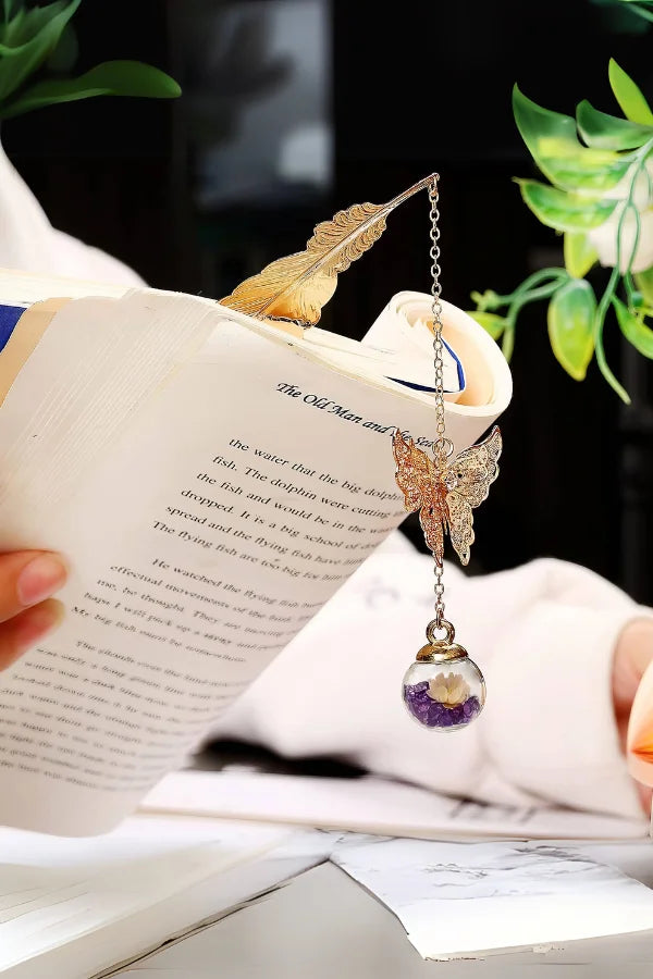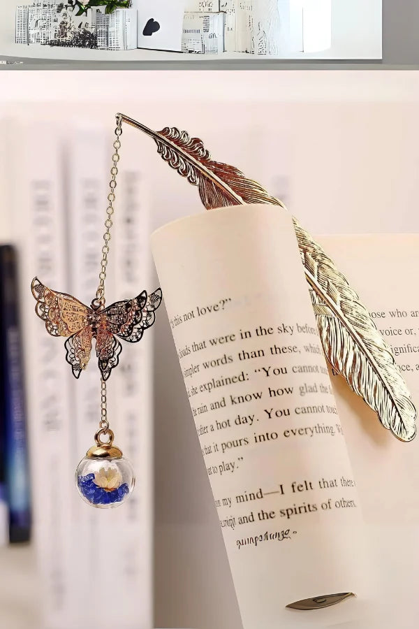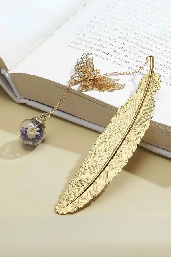 Unveil the charm of the Radiant Flutter Bookmark. showcasing an intricate feather design. The dangling butterfly and domed flower add a playful. whimsical element to your reading experience.