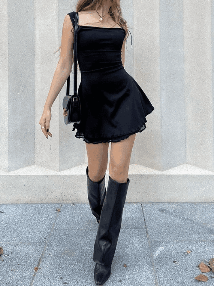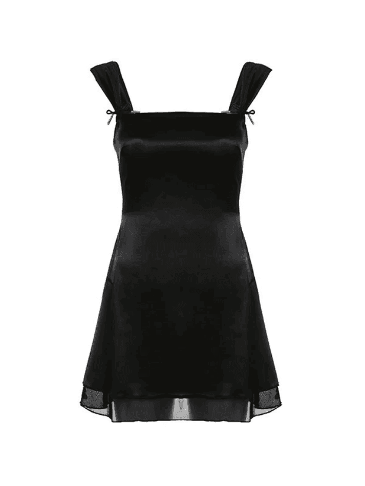 Description: Get ready to turn heads with this flirty black mini dress. Its sleek design and trendy details make it perfect for any occasion. The sleeveless silhouette and straight neckline add a touch of elegance. while the slim fit accentuates your curves. Made from a blend of polyester and spandex. this dress offers a comfortable and flattering fit. Whether you're going out for a casual day or hitting the town for a night out. this dress is a must-have in your wardrobe.