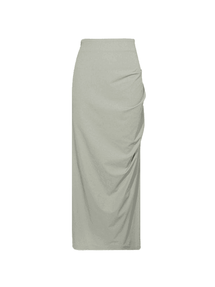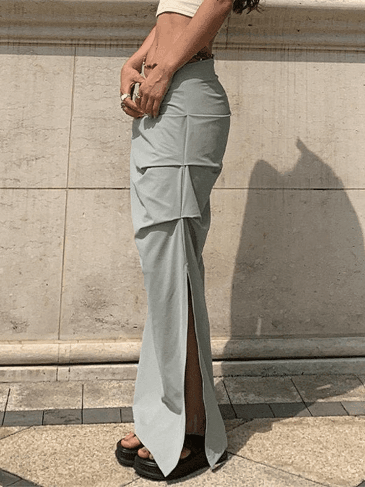 Style: Casual/Street/Y2K/Vintage/Punk Fabric Content: Polyester Blend Fit Type: Regular fit Length: Maxi Skirt Design: Shaped to a fitted silhouette. this long maxi skirt features ruched and high leg split detailing. complete with concealed zip fasten along side.