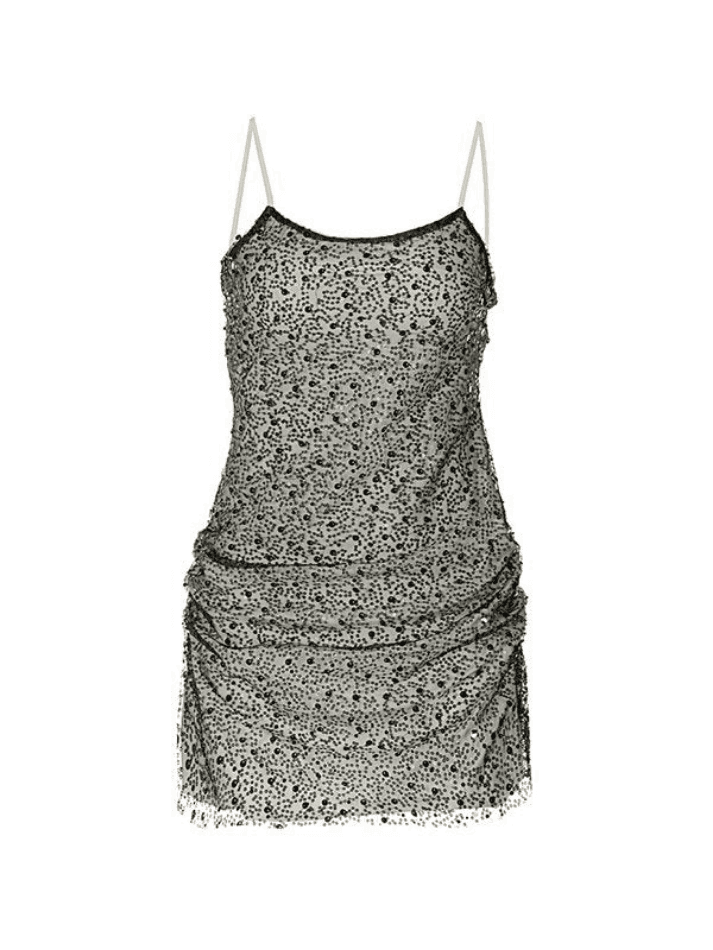 Description: Make a shimmering statement with this sparkling sequin mini dress. The glossy skirt features sequin panels throughout the body. while the fully lined design offers a comfortable fit. With ruched details and a zip fly fastening along the back. this dress is perfect for holiday celebrations. going out. dating. night outs. clubs. parties. proms. festivals. and stage performances.