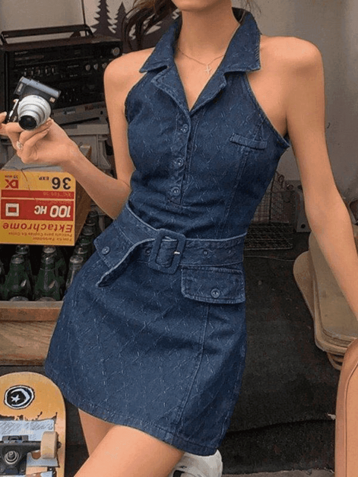 Unique design: The sleeveless denim dress features an open back and polo collar. creating a unique and edgy look that is sure to turn heads.