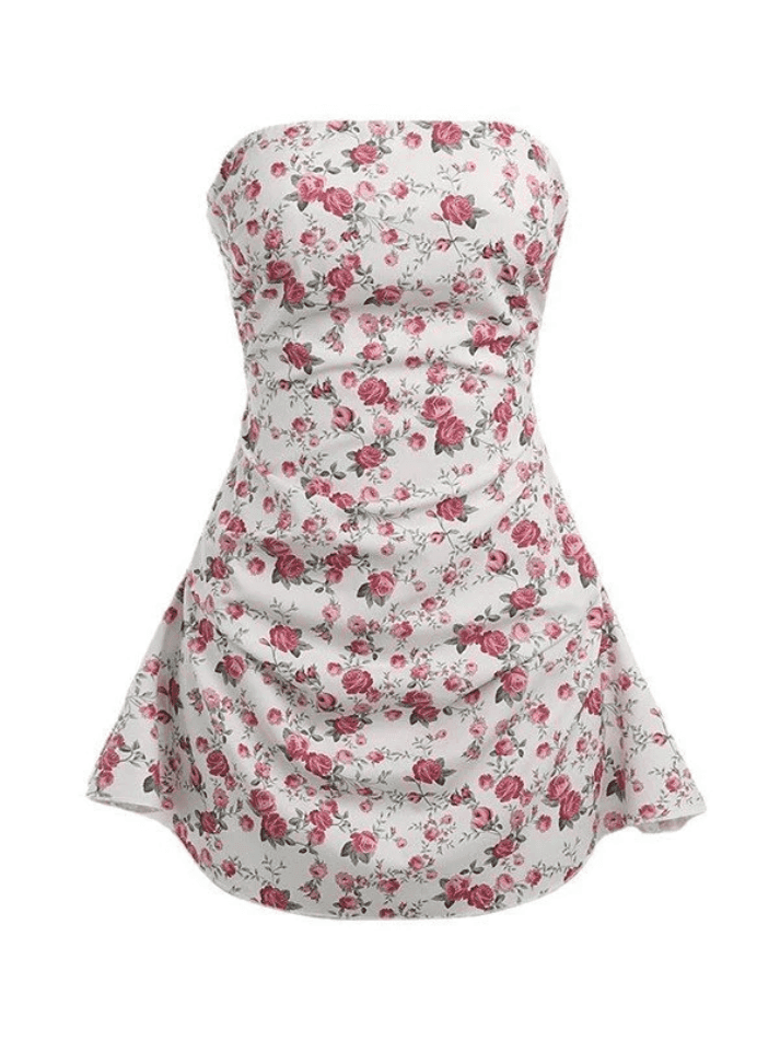 Description: Unleash your floral fantasy with this strapless mini dress. Its casual yet sexy design is perfect for a variety of occasions. from a fun day out to a romantic date night. Made with a comfortable polyester blend fabric. it offers a slim fit that accentuates your curves. The sleeveless style and strapless neckline add a touch of elegance. while the floral pattern print all over the body brings a vibrant and fresh vibe. The dress features ruched details that create a flattering silhouette and a concealed zip fly to the back for easy wearing. Whether you're going on a holiday. attending a festival. or simply enjoying a day at the beach. this dress will make you feel stylish and confident.