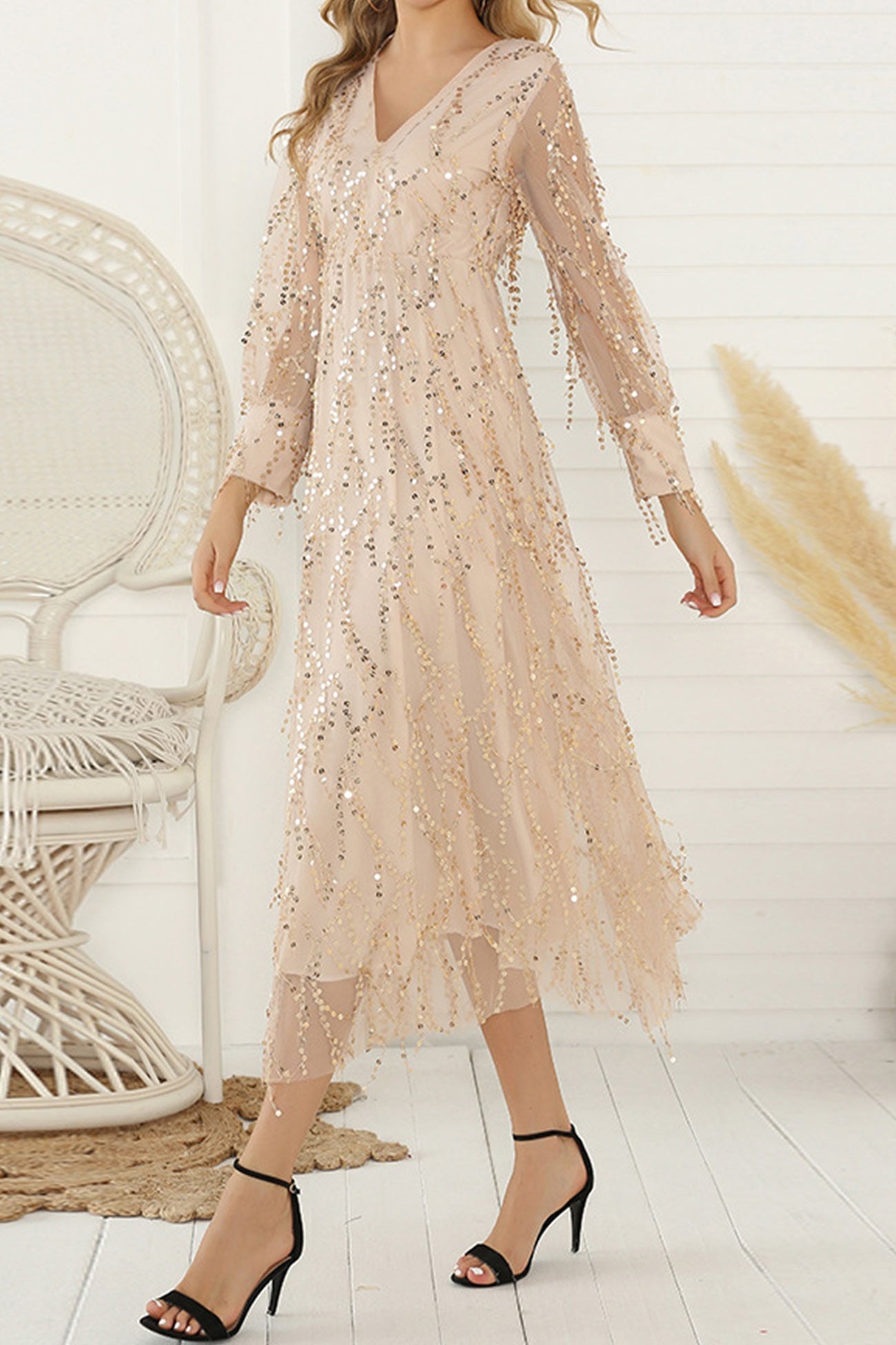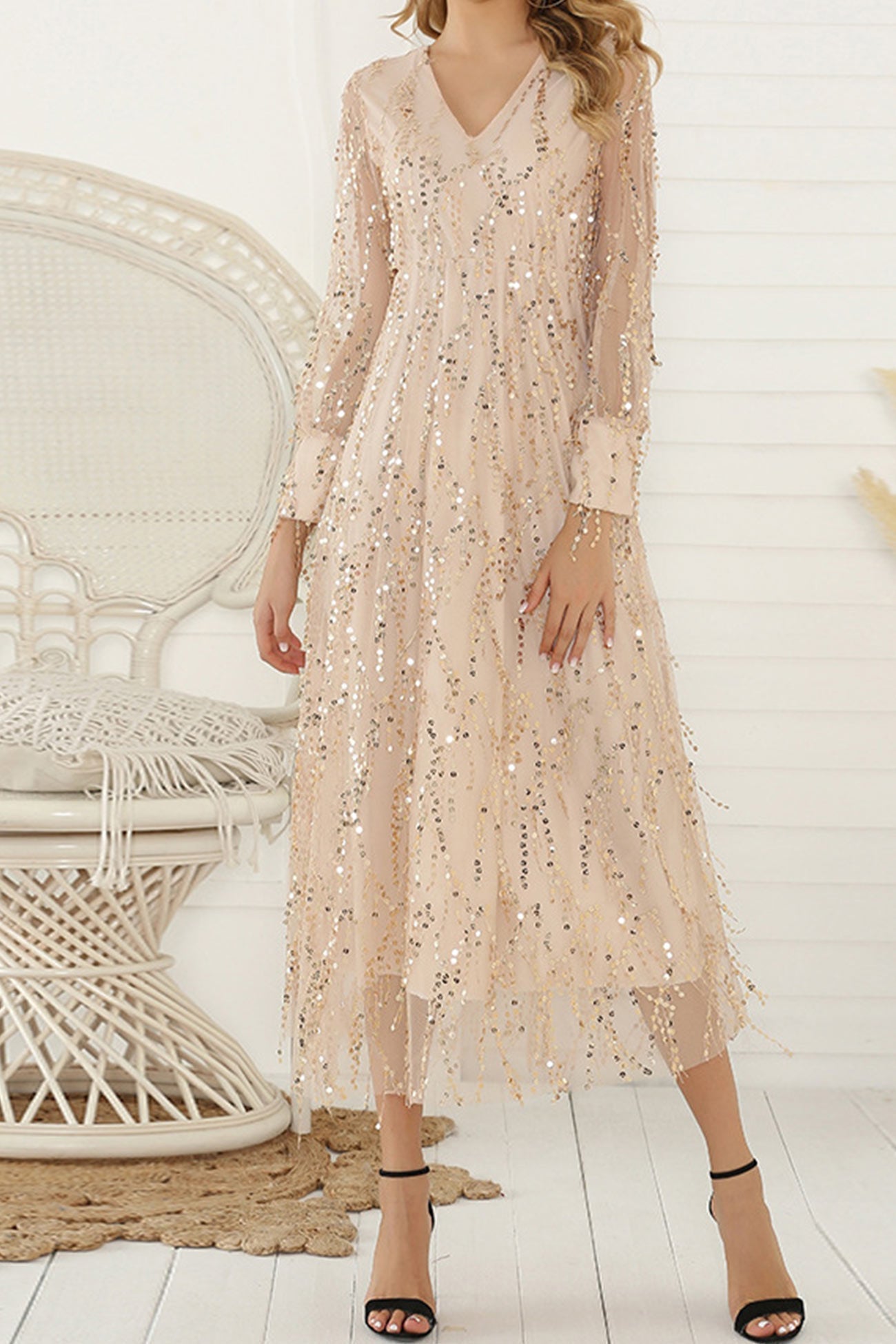 Solid Color Loose Puff Sleeves V-neck Maxi Dresses