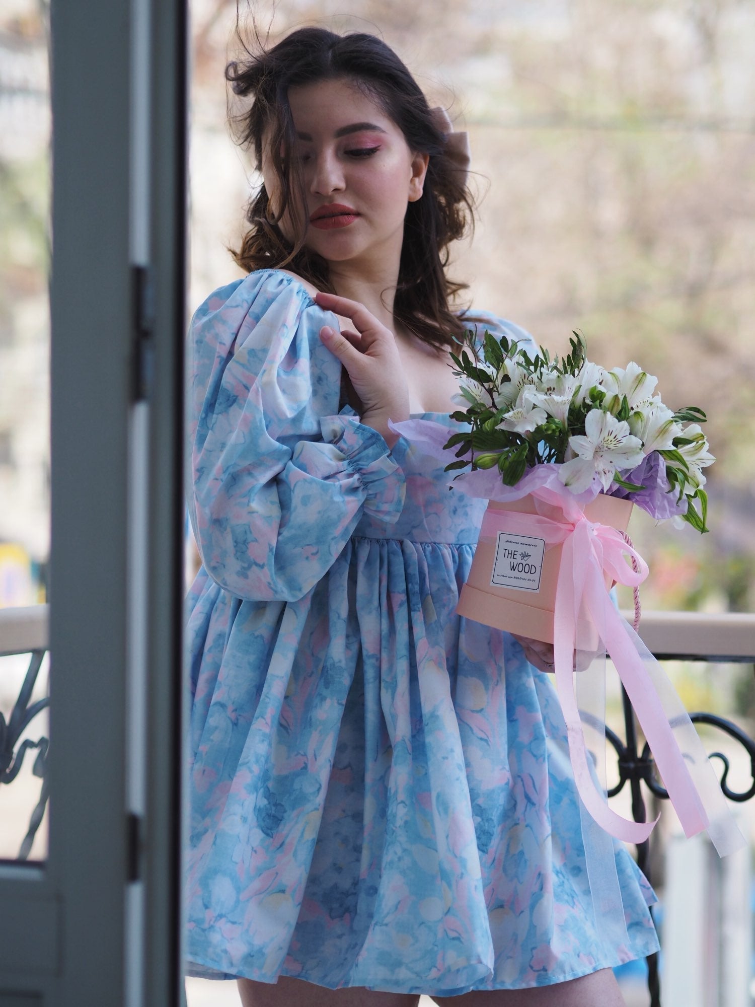 WENDY DOLL MINI DRESS has mini length. puff sleeves. blue&baby pink floral pattern. Can be wear like off-shoulder.