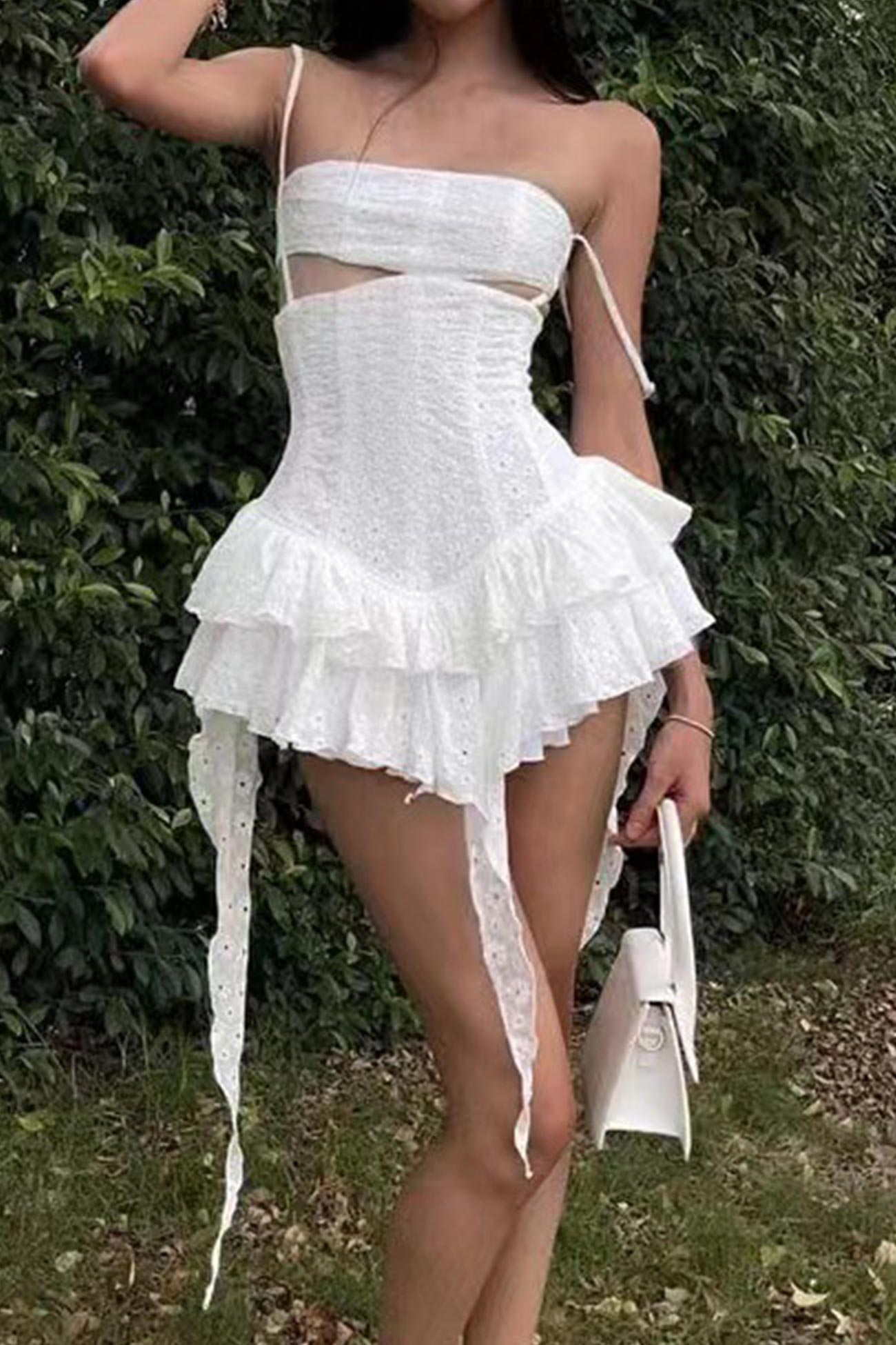 Decrease quantity for White Jacquard Cutout Ruffle Dress