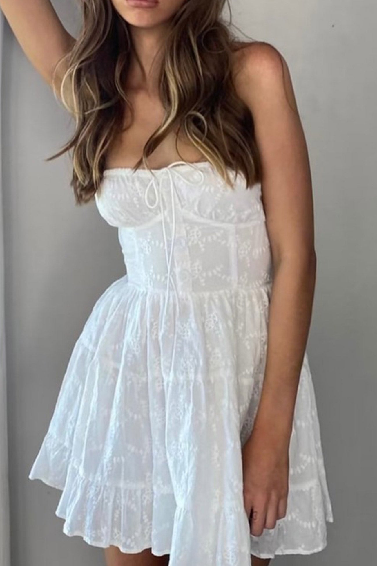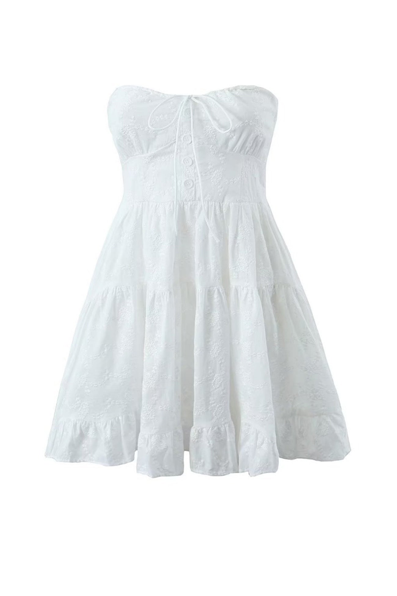 White Lace Tie-up Strapless Tiered Dress