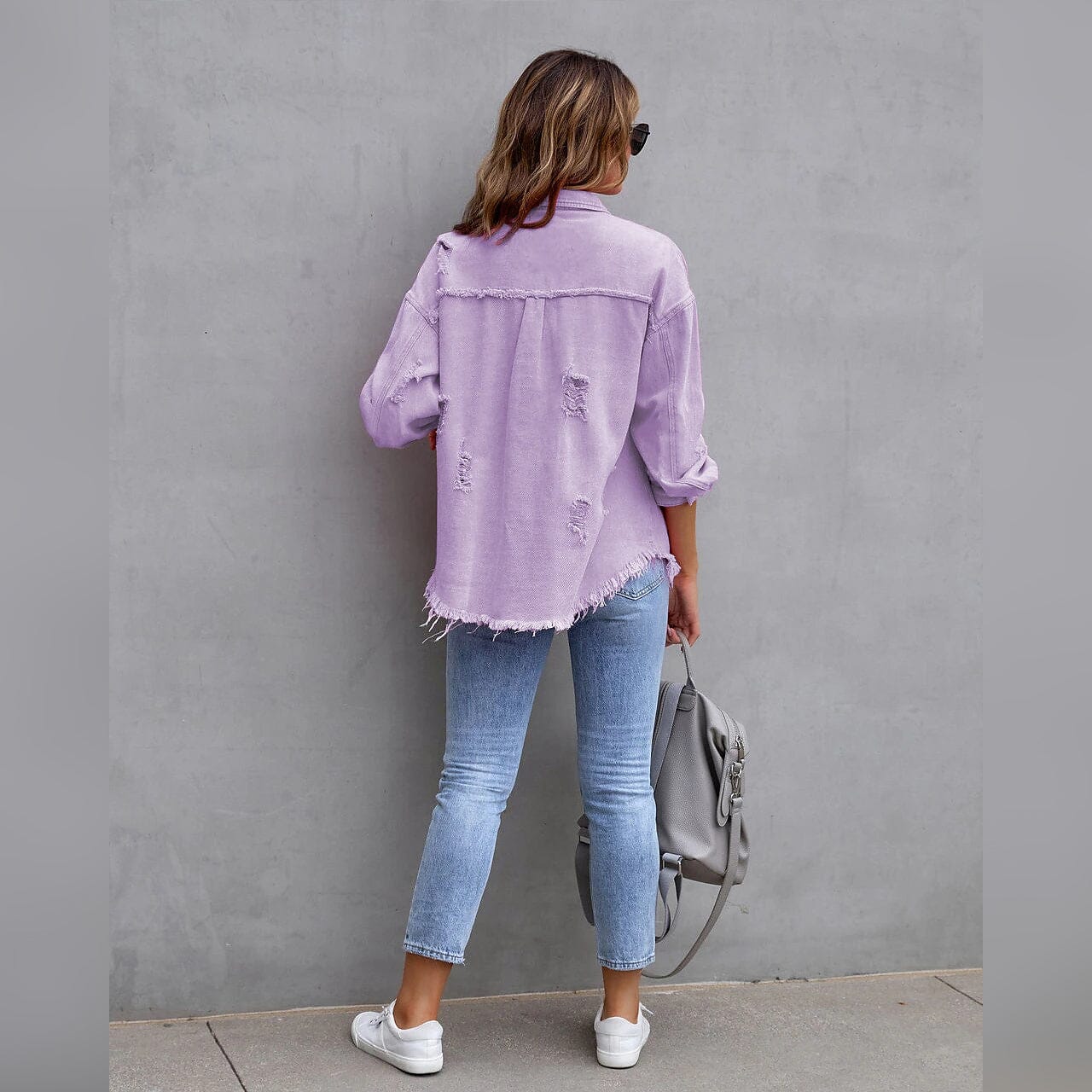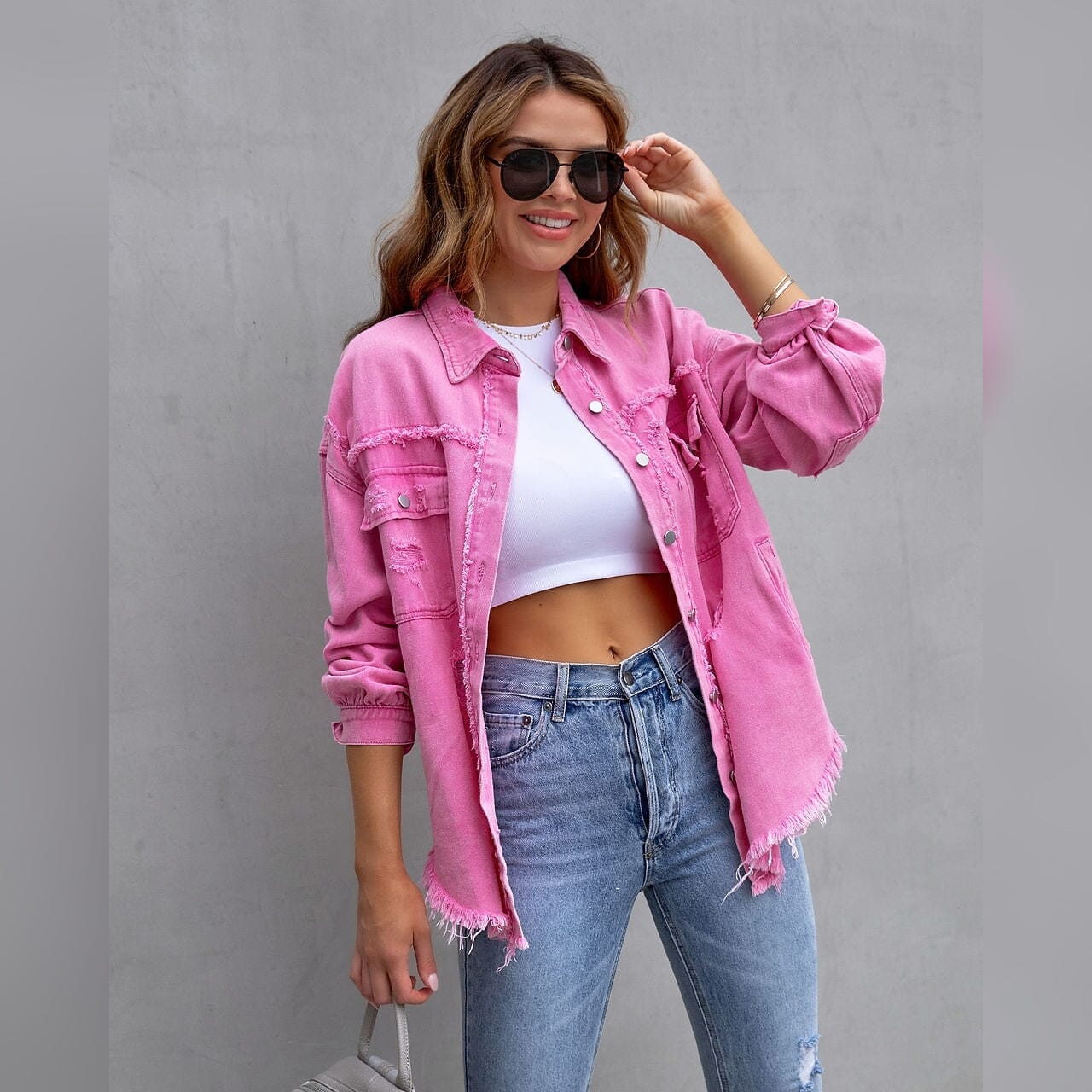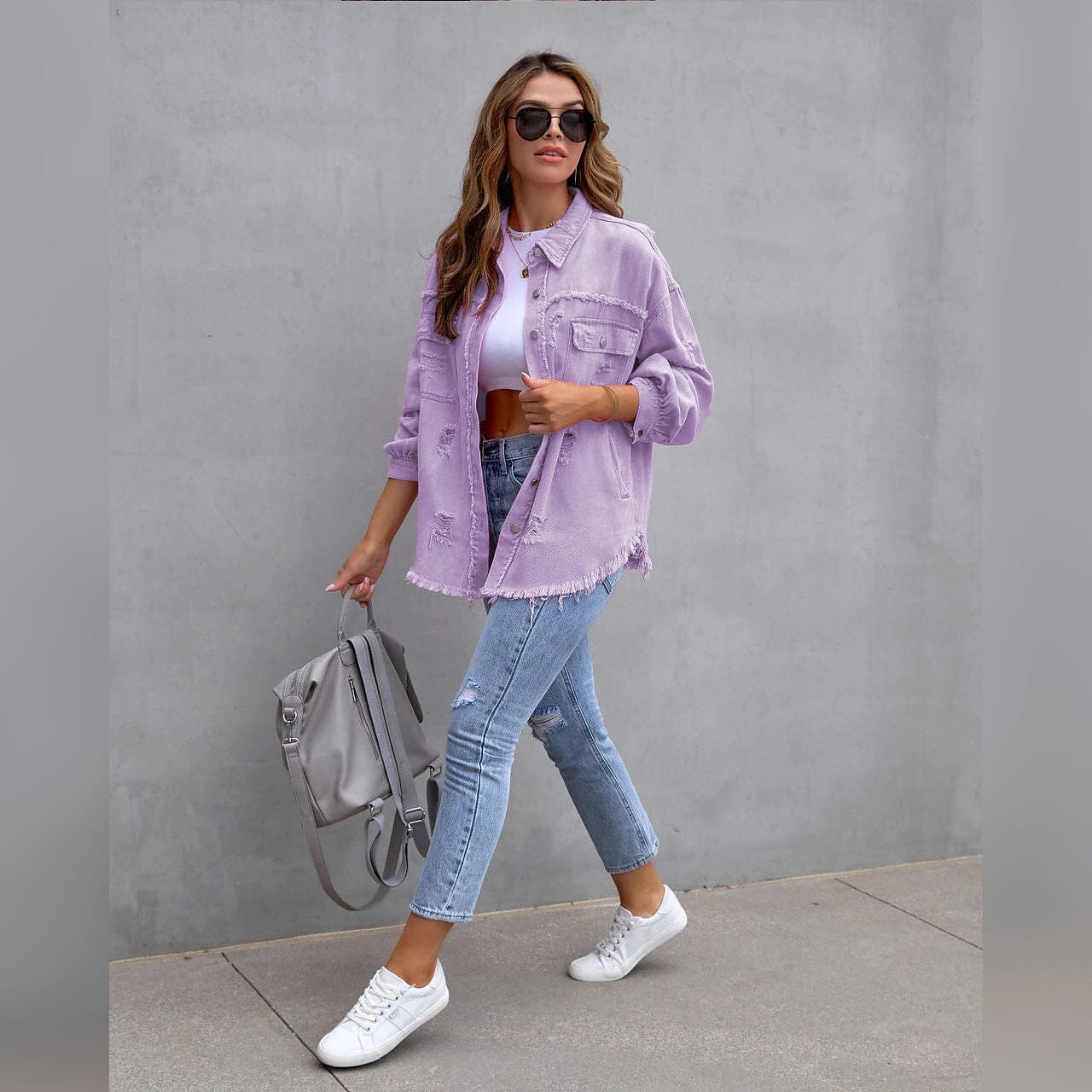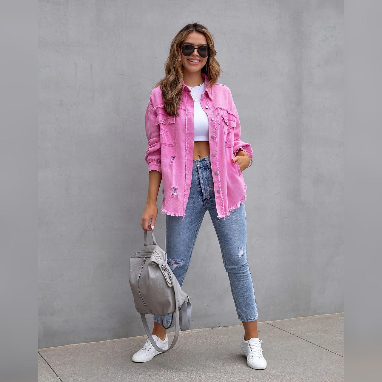 Women's Shacket Plain Button Pocket Long Sleeve Casual Daily Basic Shirt Collar Regular Denim.